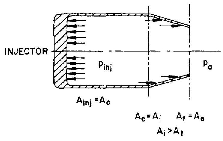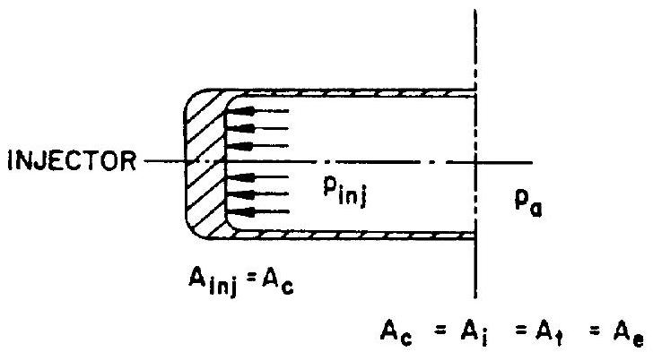 Assume we wish to generate a certain thrust . Our chamber is a straight cylinder (fig. 1-7). The pressure in this chamber has a very small effect on the cylindrical wall (the forces normal to the chamber axis will cancel each other), except for effects of friction, which we will neglect. There is no part of the chamber for the pressure to act upon at the exit. The only chamber area upon which the pressure can act is the injector plate. Since, for the cylindrical chamber, the injector area is equal to , we can write: