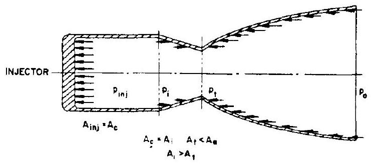 expansion to atmospheric pressure, flowing freely in all directions. By attaching a divergent nozzle, we prevent the gases from dissipating at random, and further accelerate the gases in one preferred direction only. Since this process takes place in the divergent part of the thrust chamber, the static pressures of the expanding gases produce a force on the chamber, as indicated by the arrows in figure 1-9. The expression of the thrust for the complete thrust chamber with convergent-divergent nozzle can now be written as: