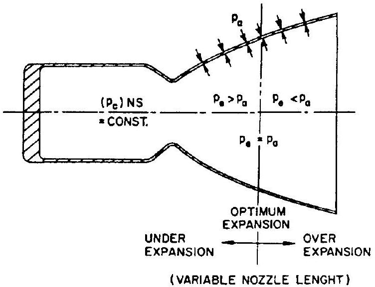 Optimum thrust for a given ambient pressure is obtained when the nozzle expansion area ratio is such that . This may be seen from figure 1-10. If the divergent nozzle section is extended in the region where , thrust will increase. Where , however, lengthening of the nozzle will decrease thrust. Hence it would be beneficial to design the nozzle to yield , to reach an optimum value for the thrust coefficient. The for this condition is called optimum nozzle expansion area ratio. Unfortunately, because of changing ambient pressure during flight, no one single is optimum. Optimization studies are usually made to determine the best compromise. Such a study is not required (except for weight and size considerations) for rockets which start and stop at the same ambient pressure, such as upper stages, where ambient pressure is zero or near zero at all times. For the special case of (vacuum conditions), would become infinity, to satisfy "ideal expansion." Even for this case, however, expansion ratios over 25 contribute little. The nozzle design is usually "cut" at this point, mainly for weight considerations. This leaves a small positive pressure at the exit which is unavailable for final gas acceleration. However, it still contributes as a positive term .