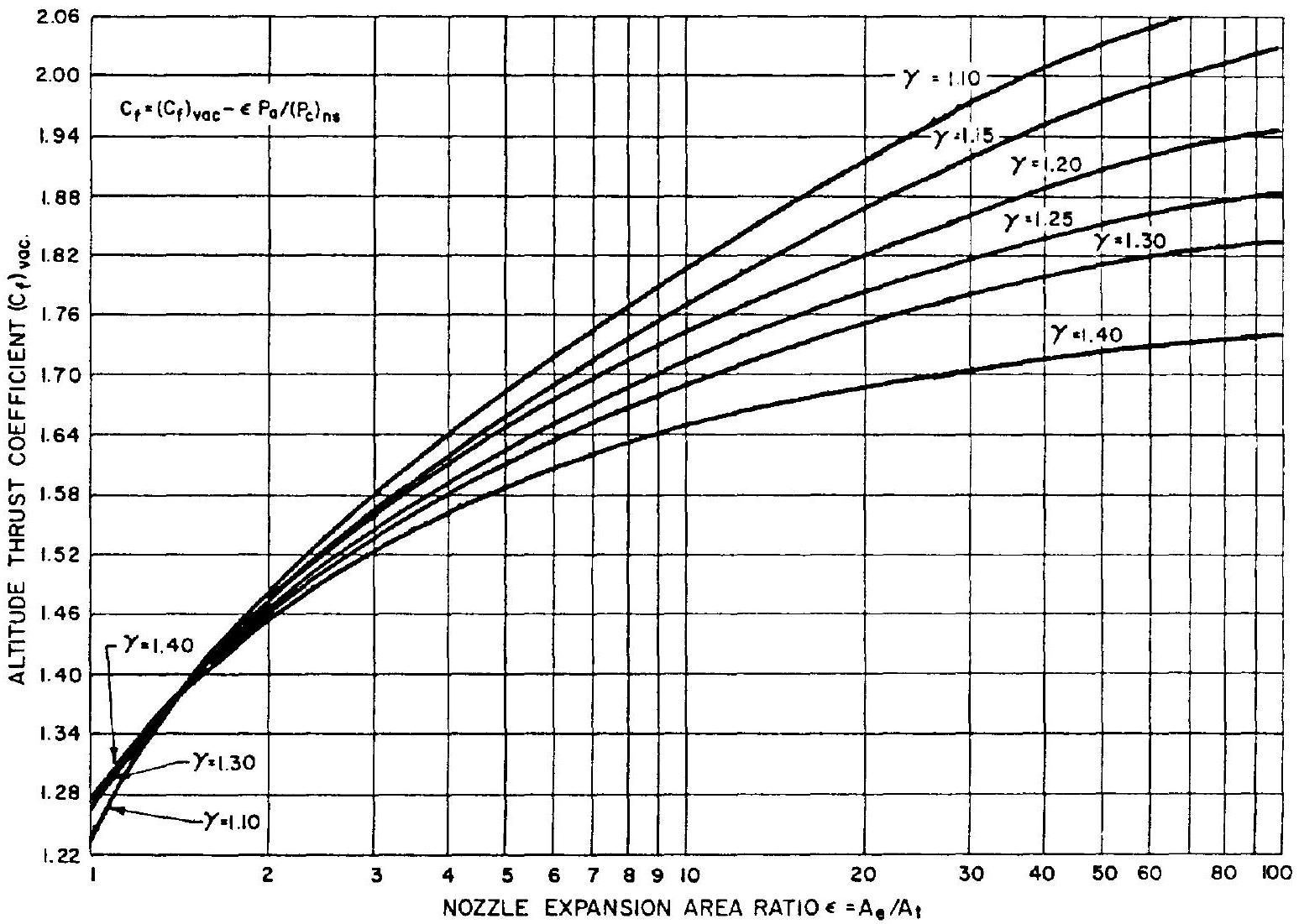 Values of the vacuum or altitude thrust coefficient plotted as functions of nozzle expansion area ratio and gas specific heat ratio are shown in figure 1-11.