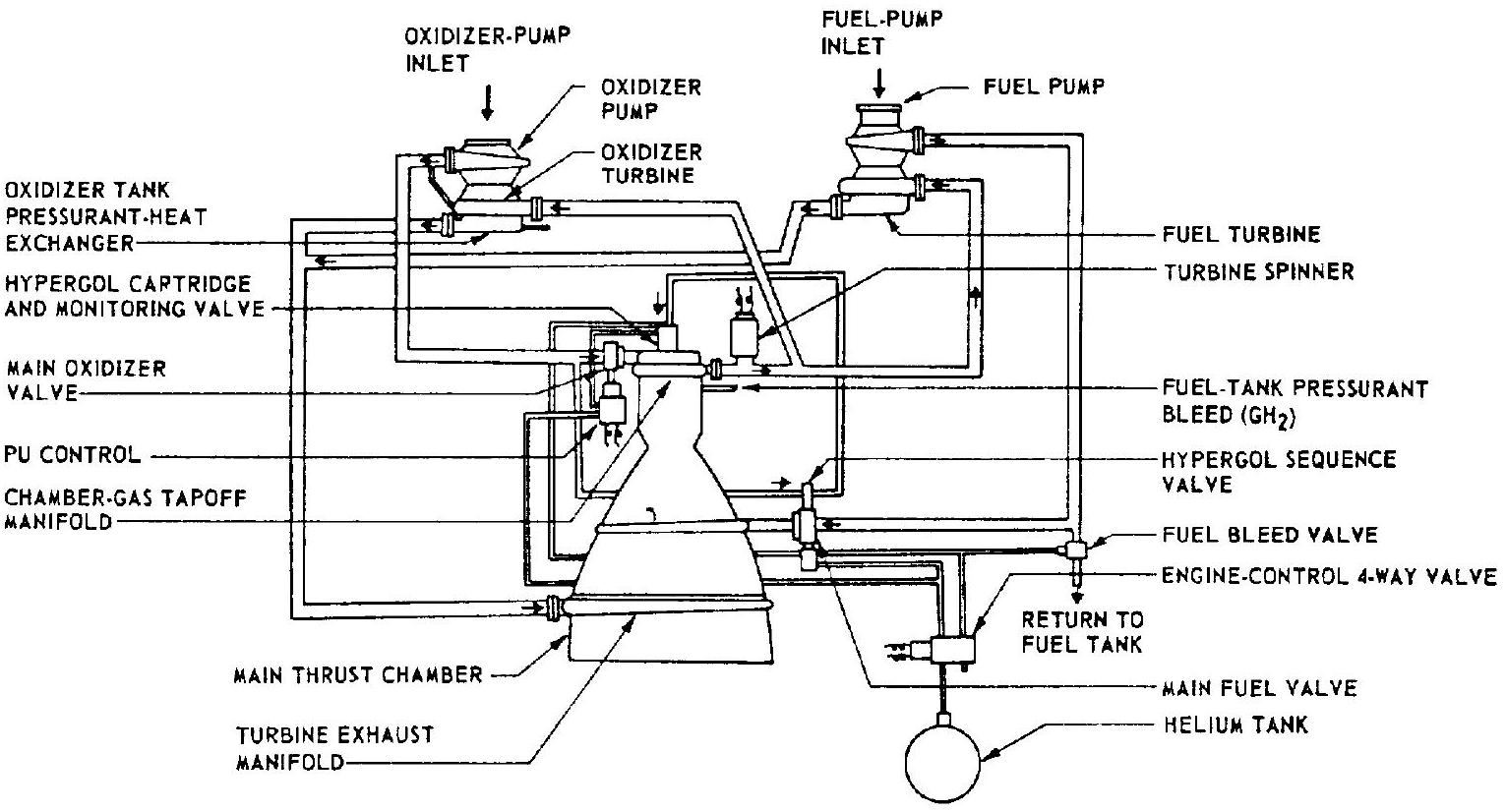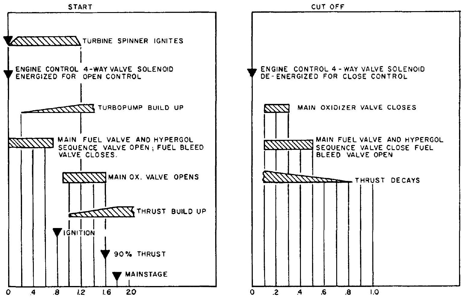 As part of the separation and staging sequence, a vehicle programer furnishes a start signal to the engine, which ignites the turbine spinner and supplies hot gases at to turbines and combustion chamber. This signal also energizes the solenoid of the engine control valve, which vents the closing side of both main propellant valve actuators and pressurizes the opening side of the fuel valve actuator with helium gas. Simultaneously, the hypergol sequence valve, which is mechanically linked to the main fuel valve, is opened and the actuator of the normally open fuel bleed valve is pressurized to close. The fuel flows through the chamber cooling jacket under increasing pump discharge pressure and injects into the combustion chamber. Ignition is achieved by the hypergolic reaction between hydrogen and the slug of chlorine trifluoride forced into the chamber by increased oxidizer-pump discharge pressure.