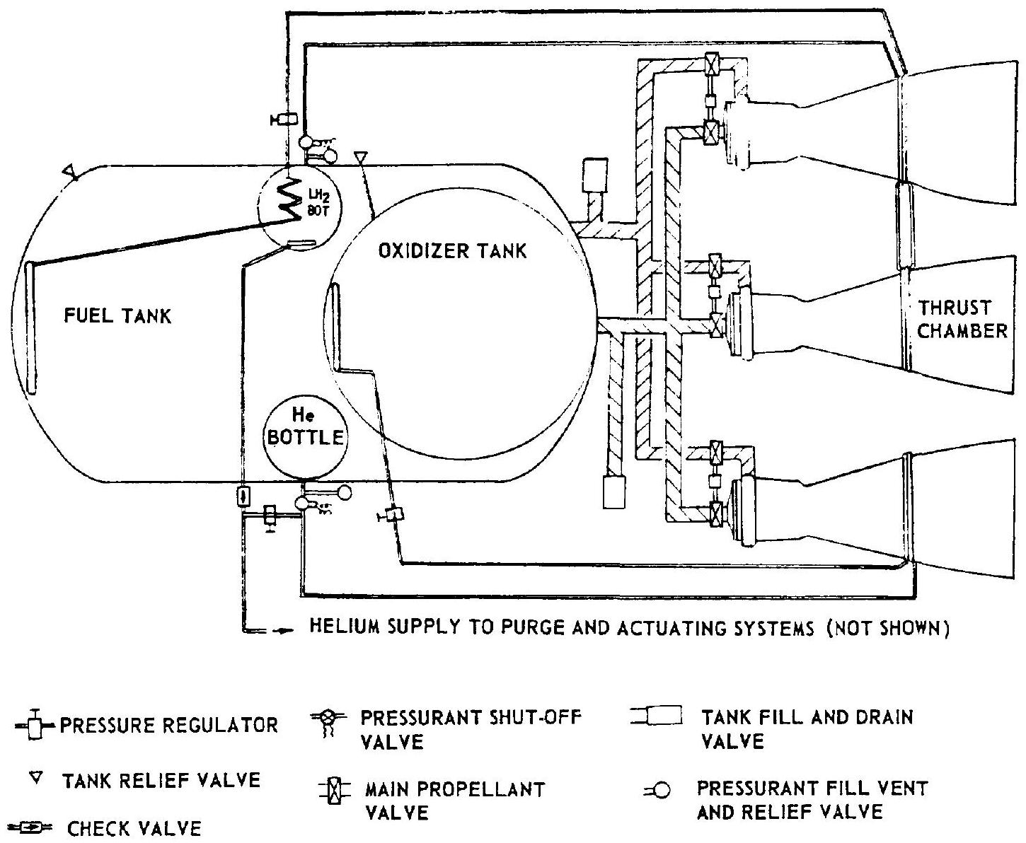 The A-3 engine is a multiple-start, gimbaled, bipropellant system. The basic system includes a thrust chamber assembly using a combination of fuel-film ( ) and radiation cooling; propellant ducts; valves; and a control subsystem. Ignition is achieved by the hypergolicity of the propellants. These are fed directly from pressurized propellant tanks, through main propellant valves, to the thrust chamber inlets. The propellant tanks and their gas pressurization system are considered part of the engine propellant feed system. Gaseous helium supplied from a high-pressure helium bottle located inside the main fuel tank is used for main oxidizer tank pressurization. The main fuel tank is pressurized by gaseous hydrogen supplied from a liquid hydrogen bottle which is pressurized by helium and which is also located inside the main fuel tank. Both pressurants are heated in heat exchangers located at the thrust chamber nozzle extensions before they are expanded through pressure regulators and transferred to the propellant tanks. Helium gas is used to operate the main valves and the gimbal actuators, and to purge the propellant manifolds during start.