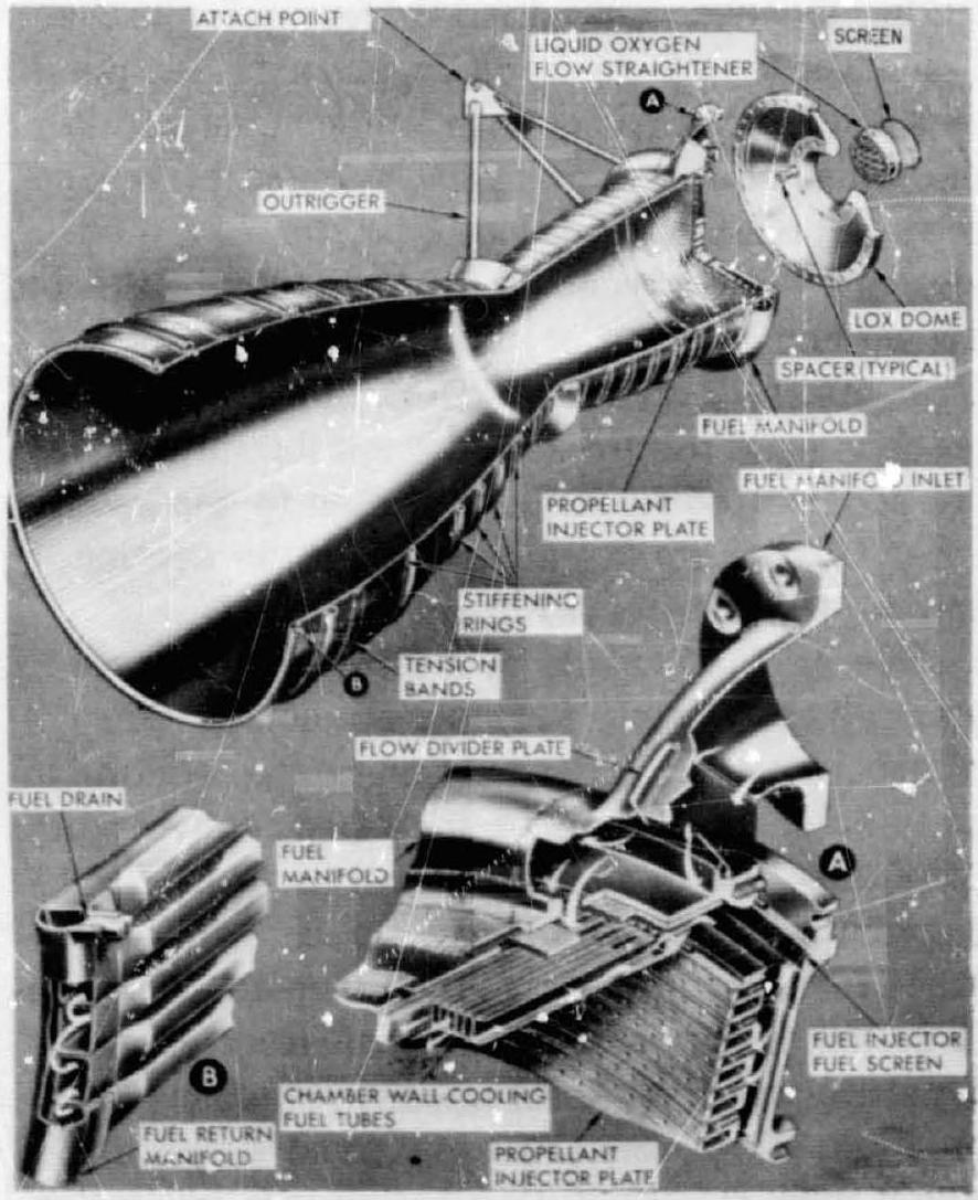 into the return tubes. The fuel then flows through an injector fuel screen into the radial injector passages, and finally through the fuel injector orifices into the thrust chamber combustion zone. The fuel manifolds of this chamber are made of 4130 steel or 347 stainless steel. Other structural members, such as tension bands, stiffening rings, and outriggers were all made of 4130 steel. The oxidizer (liquid oxygen) enters the LOX dome under pressure through a screened central port and is distributed within the dome directly to the liquid oxygen passages and orifices (fig. 4-2).