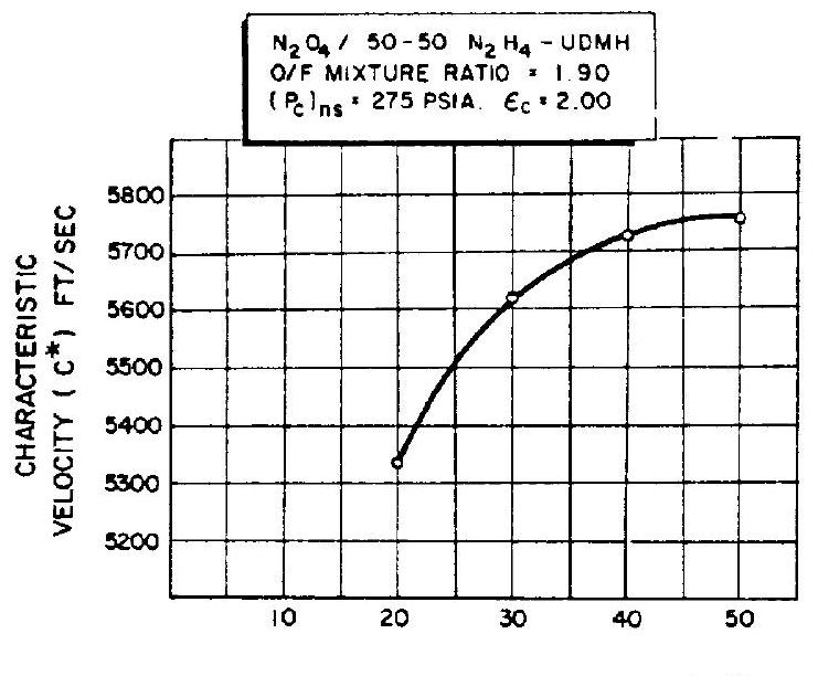 Since the value of is in nearly direct proportion to the product of and is essentially a function of . The effect of on in an experimental combustion chamber is shown in figure 4-7. The value increases with to an asymptotic maximum. Increasing beyond a certain point tends to decrease overall engine system performance because of the following: (1) Larger results in higher thrust chamber volume and weight. (2) Larger creates more surface area in need of cooling. (3) Larger increases friction losses at the chamber walls. In actual design practice, optimization analyses will determine the minimum possible combustion chamber consistent with efficient combustion.