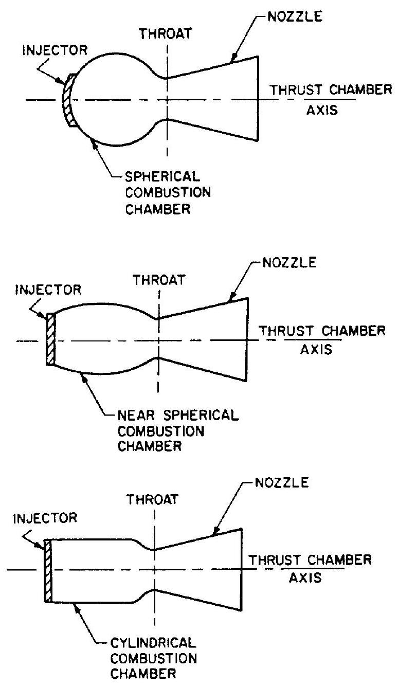 The spherical or nearly-spherical chamber, as compared to the cylindrical one of the same volume, offers the advantage of less cooling surface and weight. A sphere has the smallest surface-to-volume ratio. For equal strength of material and chamber pressure, the structural walls of the spherical chamber are about half the thickness of the walls of a cylindrical chamber. However, the spherical chamber is more difficult to manufacture and has poorer performance under most circumstances. For these practical reasons, the design details of the cylindrical combustion chamber will be treated in this book. Several