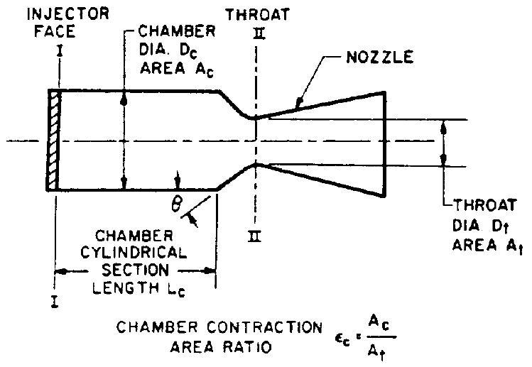 In the design layout of the cylindrical combustion chamber of a given and , the value of the contraction area ratio, ( ) can be optimized through careful studies of the following factors: (1) Combustion performance in conjunction with the injector design (2) Chamber gas flow pressure drop (3) Chamber wall cooling requirements (4) Combustion stability (5) Weight (6) Space envelope (7) Ease of manufacturing