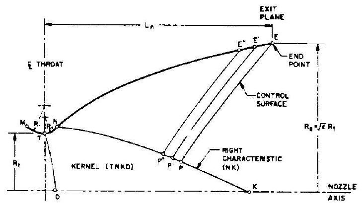 For those familiar with compressible flow theories, it is noted that, using transonic flow analyses, a constant-Mach-number line TO can be defined at the throat. Given the flow condition along TO and the solid boundary TN, a kernel flow field TNKO can be generated by the method of characteristics developed in gas dynamics. The kernel of the rocket nozzle contour is defined as that portion of the supersonic flow field determined entirely by throat conditions. The last right characteristic line NK of kernel TNKO, and thus the location of the point N along contour TN, is to be determined by specific design criteria.