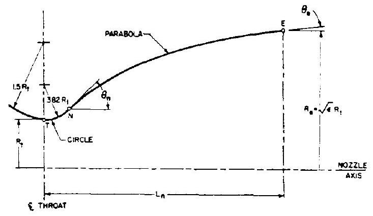 One convenient way to design a near-optimumthrust bell nozzle contour is through the use of the parabolic approximation procedures as suggested by G.V.R. Rao. The design configuration of a parabolic approximation bell nozzle is shown in figure 4-13. The nozzle contour immediately upstream of the throat is a circular arc with a radius of . The divergent section nozzle contour is made up of a circular entrance