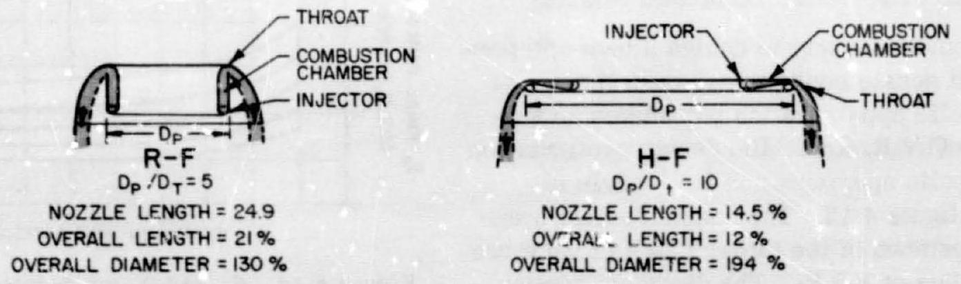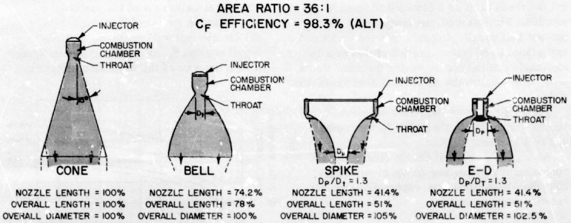There are two basic types of annular nozzles: the radial in-flow type (spike nozzle) and the radial out-flow type (expansion-deflection or E-D; reverse-flow or R-F; and horizontal-flow or H-F nozzles). They are shown in figure 4-15, together with conventional conical and bell noz- zles. For comparison of the effect of nozzle type on size, all nozzles shown are scaled to the same thrust level, nozzle expansion area ratio, and theoretical nozzle efficiency. These nozzles show potential of adapting their geometry to space vehicle application, because shortened nozzles reduce interstage structure weight and will permit an increase in payload through increased performance for a given length.