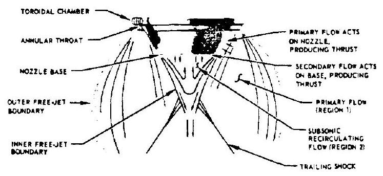 The primary flow (high-pressure gases) which produces the major portion of the engine thrust is exhausted from an annular-type combustion chamber and expands against the metal surface of the center trunated-spike nozzle (fig. 4-18). The characteris of the primary flow field upstream of the base, shown as region 1 in figure 4-18, are determined by the annular throat geometry, the nozzle wall contour, and the ambient pressure. The annular primary flow continues to expand beyond the nozzle surface and encloses a subsonic, recirculating flow field in the base region (region 2). The pressure acting on the nozzle base contributes additional thrust to the nozzle.