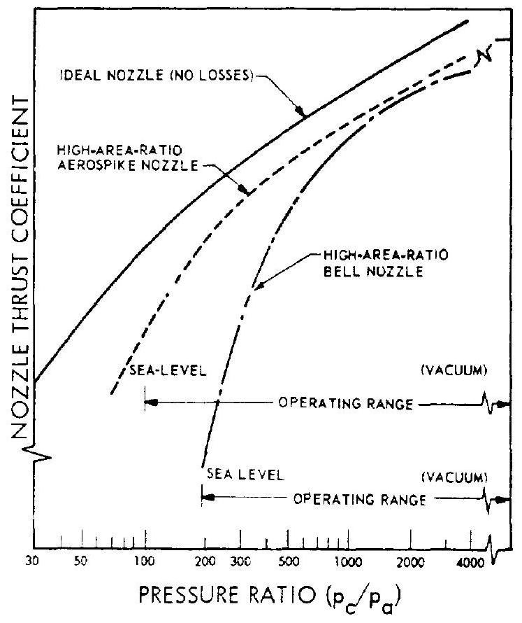 Figure presents the performance comparison of various nozzle designs. The nozzle thrust coefficient for an ideal nozzle (i.e., a variable-area-ratio nozzle having the optimum expansion for each chamber pressure to ambient pressure ratio, ) is shown together with those of the high-area-ratio aerodynamic spike and bell nozzle. As is evident, the curve of the aerodynamic spike follows the ideal nozzle performance (altitude-compensation), rather than dropping off rapidly like the bell design at low (i.e., sea level) operating points. All nozzles have a higher at a high (i.e., vacuum).