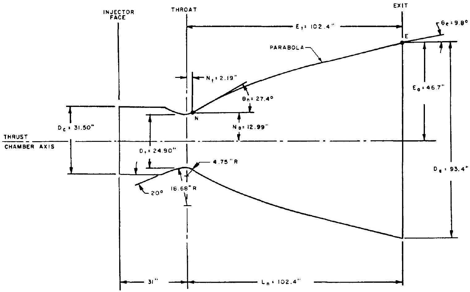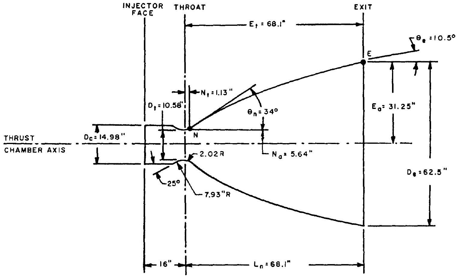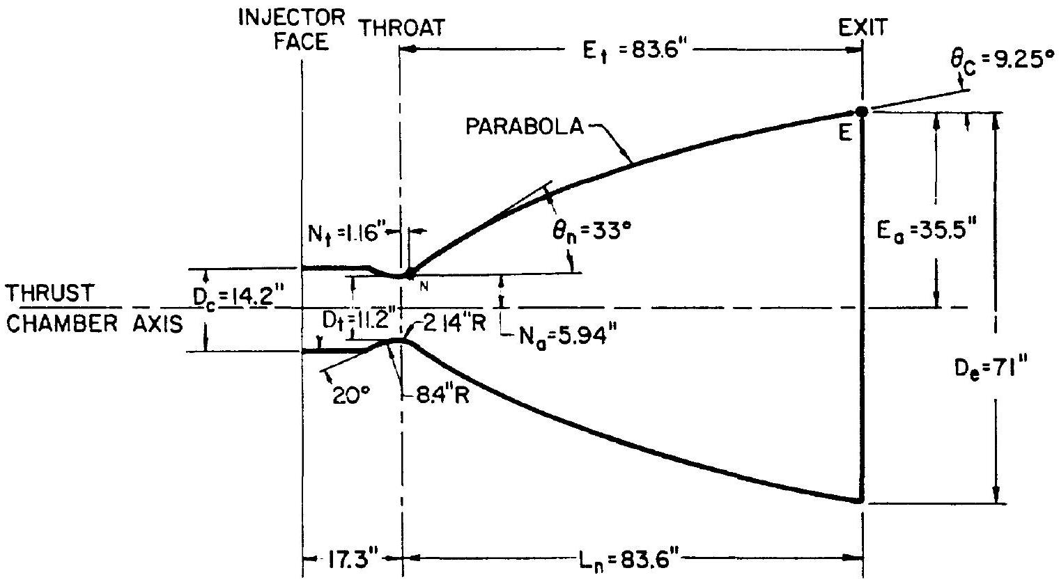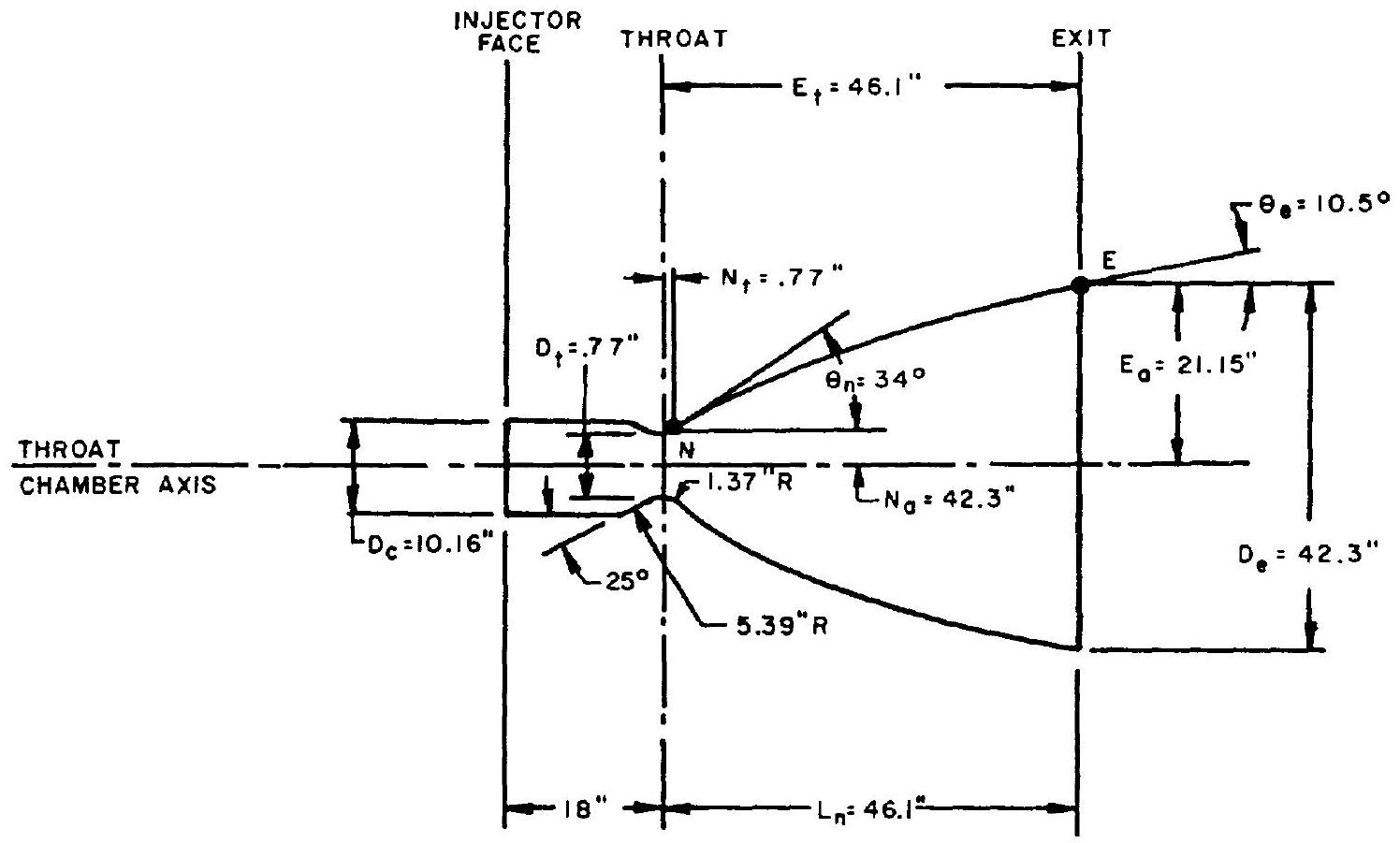 With the aid of the established coordinates for points N and E , and the angles and , a parabola can be fitted to complete the contour. The general layout of the A-1 stage engine thrust chamber is shown in figure 4-20. With the aid of a computer program, more accurate calculations of the divergent nozzle contour can be made by the method of characteristics.