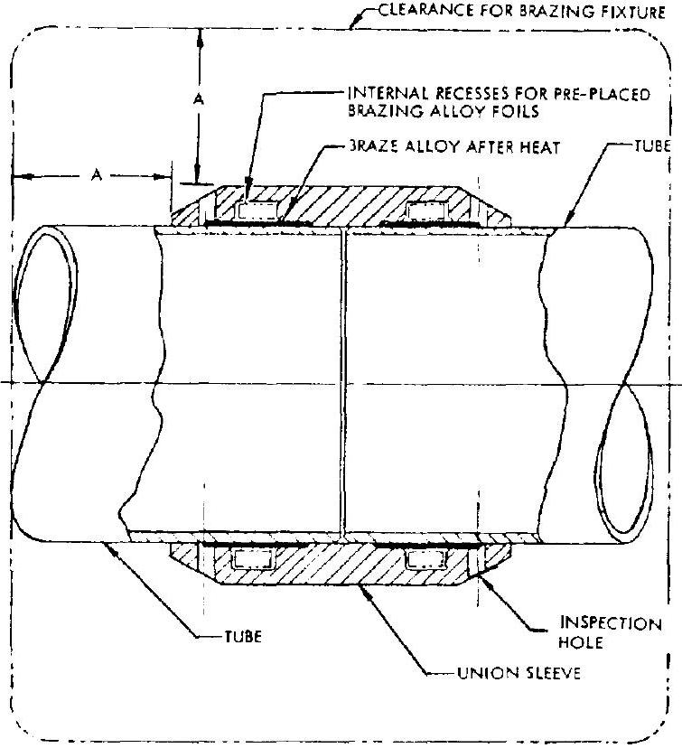 A preplaced braze alloy in the form of 0.001 to 0.003 -inch-thick foil is snapped into recesses inside of the union sleeve. Diametrical clearances of inch between sleeve and tubing are found to give satisfactory results. Holes are provided on the sleeve to permit visual joint inspection after brazing. The quality of the brazed joint can be also judged by the degree of external braze-alloy filleting at the outer edges of the sleeve. The recesses for the braze alloy are located midway between tube and sleeve ends. The length of the union sleeve can be determined by the braze bond shear strength and the effective bond area. Sleeve lengths range from 0.5 to 2 times the tube outside diameter.