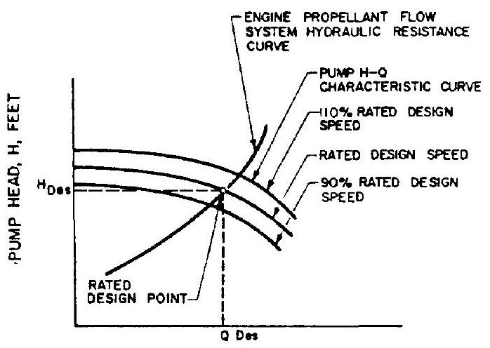 The required pump developed head at the design propellant flow rate (i.e., engine thrust level) is dictated by the sum of the hydraulic resistances within the engine propellant flow system. These resistances include the pressure drops across injector, thrust chamber manifold, cooling jacket, propellant valves and ducts, as well as the injector end thrust chamber pressure. An additional pressure margin is usually allowed for systems calibration. An engine propellant flow system hydraulic resistance curve representing the resistance head to flow-rate relationship at various pump operating levels is shown in figure 6-19.