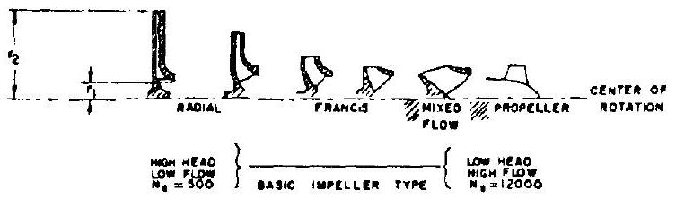 - Francis-type impeller.-This type has an axial inlet, a radial discharge, and is used for lower heads. Specific speed ranges from 1200 to 2400. Geometric proportion, , varies from 1.3 to 1.8 .