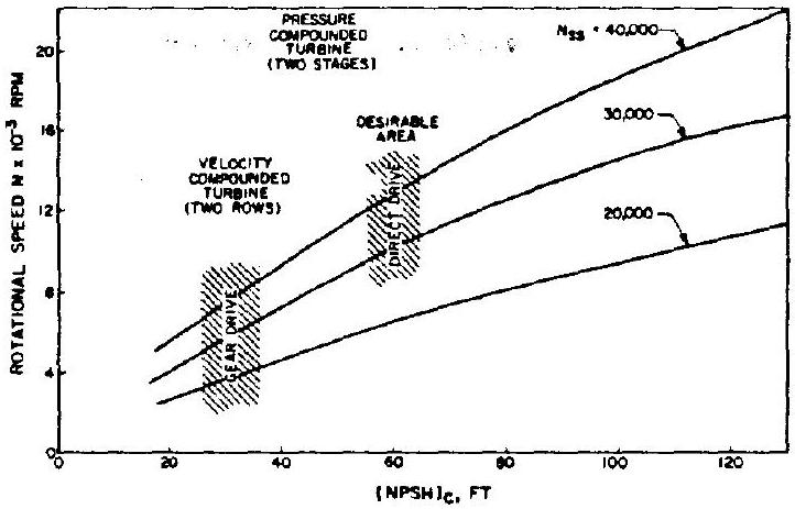 In the design of turbopump systems the following parameters, which are often interdependent, are considered paramount and will be discussed: (1) Propellant properties (2) Pump developed heads and flow rates (3) Pump specific speeds (4) Pump net positive suction head (NPSH) (5) Pump efficiencies (6) Turbine overall performance and operating efficiency (7) Turbopump system cycle efficiency (8) Turbopump system calibration and offdesign characteristics No simple rules are available for optimizing the correlations of these parameters when designing a specific type of turbopump for a given engine systems application. Generally speaking, however, available pump suction pressure together with the basic pump flow characteristics will determine the maximum shaft speed at which the unit can operate. The higher this shaft speed, the lower the turbopump weight is likely to be. Once the pump speed is determined, turbine type, turbine driving arrangement, and turbine power source are selected on the basis of efficiency, weight, simplicity, and other factors.