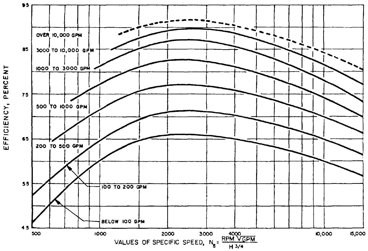 Figure 6-20 indicates typical pump specific speeds for various impeller geometries. For a given speed, a low value of specific speed is characteristic for low-volume flow, high-headrise pumps. Higher specific speed indicates a higher volume flow, low-head-rise pump.