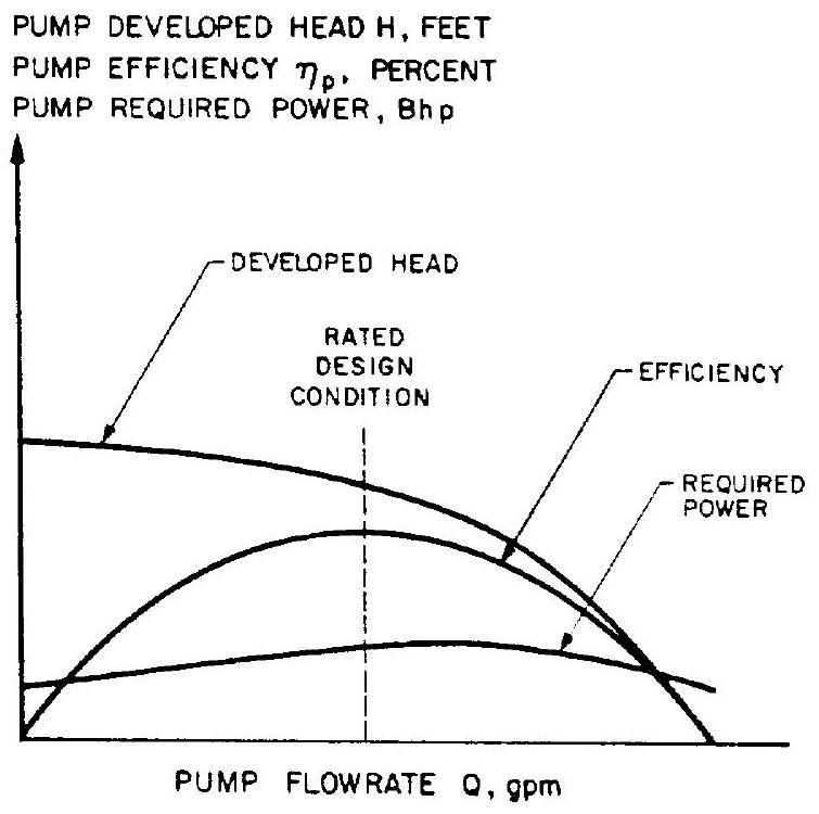 Any value for developed fluid head of a given pump is tied to a corresponding level of fluid flow at any impeller rotating speed. At the maximum flow rates, the entire pump drive energy is consumed by internal flow losses and kinetic energy imparted to the fluid. Thus the measured head rise at the pump outlet is zero. At the other extreme, where fluid flow is zero (except for secondary flows), head rise is a maximum. A pump developed head versus flow capacity curve, commonly called curve, is derived by connecting the pump operating points between the two extremes for constant speeds. A family of curves is thus obtained experimentally for the range of speeds through which the pump may operate, all of them having similar parabolic shape. Typical H-Q curves of a pump at various speeds are shown in figure 6-19, along with the system flow resistance curve. Together they form the design operating range of a system.