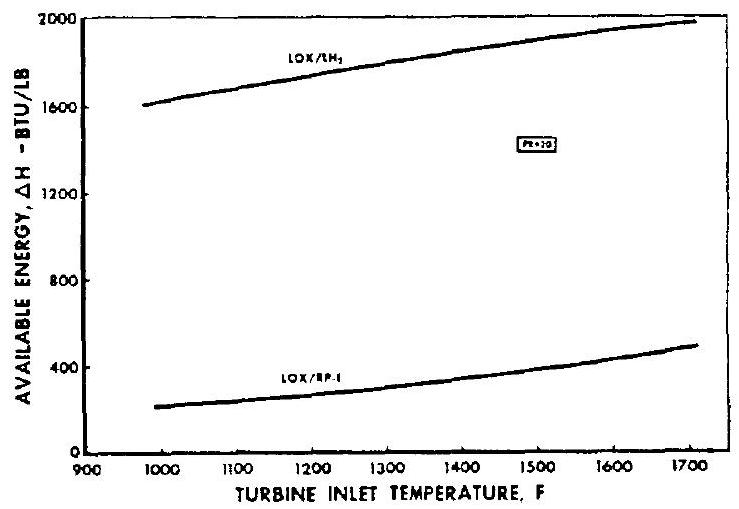 Figure 6-25 shows the relationship between turbine-inlet temperature and available working fluid energy for a turbine pressure ratio of 20 for the two propellant combinations and . Turbine inlet temperatures are limited by the high-temperature properties of the turbine construction materials. A practical design limit is around . Above certain levels the gain from a higher turbine-inlet tem-