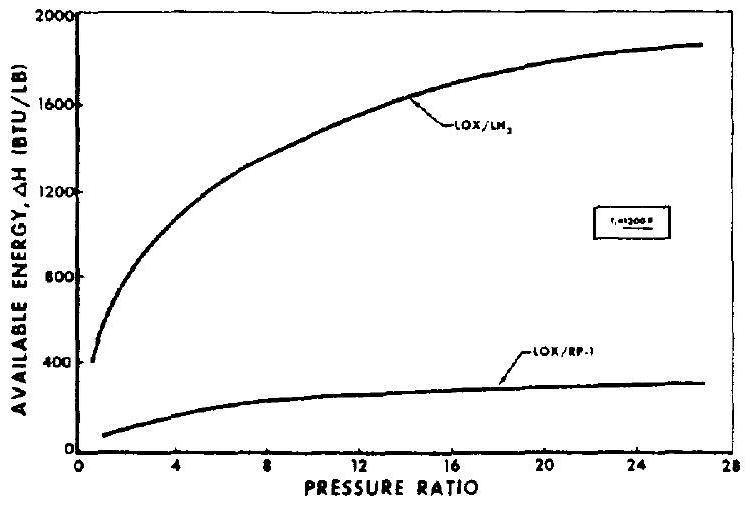 Figure 6-26 shows the relationship between turbine pressure ratio and available energy of the working fluid for a turbine-inlet temperature of , again for the propellant combinations and . Although a large amount of energy may be available in a working fluid, it may be difficult to convert it efficiently into turbine shaft horsepower because of the severe weight limitations on rocket engine turbopumps. Thus the available pressure ratio of a turbine often cannot be fully used.