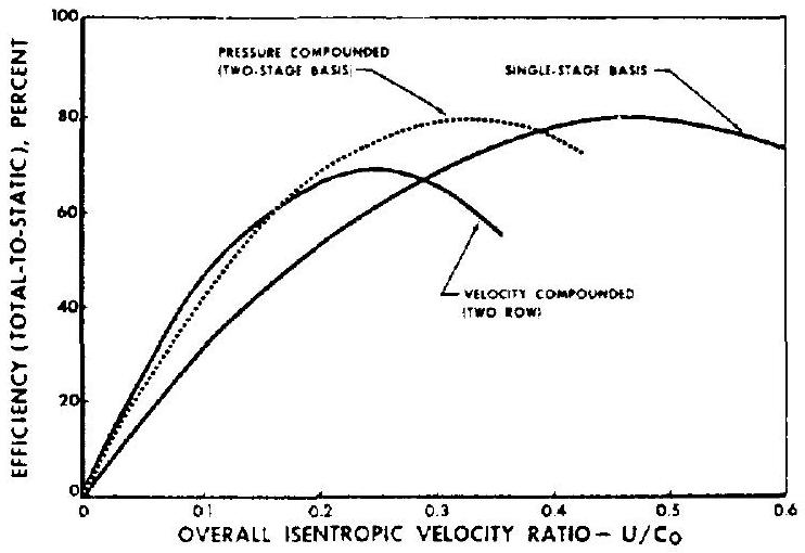 The design of turbines for rocket turbopumps tends toward the simpler and lighter impulse types, with most of the expansion occurring in the stationary elements. Figure 6-27 shows the typical efficiency curves of various impulse-type turbines. The design problem becomes one of balancing efficiency (optimum velocity ratio , weight (number of stages or rows), and structural considerations. A higher performance can be achieved by employing a working fluid with high available energy, and by matching its high gas spouting velocity with a high rotor blade pitch speed . However, the blade speed is often limited by the required pump rpm, by the practical size of the rotor wheel, and by the strength of materials. The optimum velocity ratio (or optimum value of blade speed for a given gas spouting velocity) is reduced by the use of velocity or pressure-compounded arrangements (shown schematically in fig. 6-9 and 6-10). However, these designs increase weight and complexity.