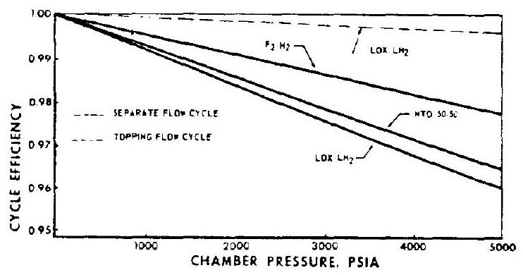 where topping flow cycle efficiency ideal energy required to pump 1 pound total propellant flow of an engine system from pump inlet to main cham- ber nozzle stagnation pressures specific heat of the thrust chamber gases, Btu/lb-F thrust chamber nozzle stagnation tem- perature, = propellant mixture ratio of the engine system, O/F pressure head, based on the difference between thrust chamber nozzle stag- nation and oxidizer pump inlet pres- sures, ft =pressure head, based on the difference between thrust chamber nozzle stag- nation and fuel pump inlet pressures, ft Topping flow cycle efficiencies may range from 0.996 to 0.9996 . Typical cycle efficiency versus chamber pressure curves of various propellants are illustrated in figure 6-28.