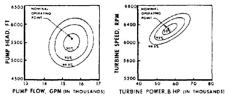 Ideally, an engine system is designed to operate at a single set of conditions, specifically at rated thrust and mixture ratio. Each of its components in turn is designed for optimum function at that rated thrust level. In addition, however, most of these engine components, notably pumps and turbines, are also required to operate satisfactorily within a certain range away from the design point. This may be caused by- (1) System and component calibration characteristics (2) System operational deviations (3) System start and shutdown transients (4) Special system requirements, such as throttling Figure 6-29 illustrates typical operating ranges for the turbopump of a rocket engine system. The elliptically shaped areas represent ranges of operational probability. For instance, the 95 -percent ellipse envelopes those values at which the pumps or turbine will operate with a 95 -percent probability.