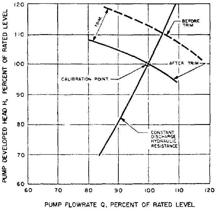 necessary to calibrate a turbopump prior to its integration into an engine system. Here, the performance of each pump is determined experimentally. By modifying the pump geometry (impeller trimming) and varying the discharge hydraulic resistances, the desired operating characteristics required by the engine system are achieved. For turbopumps with a single direct or geared turbine drive (as shown in fig. 6-13), the calibration procedure begins with the experimental determination of that shaft speed at which one of the pumps (usually the oxidizer pump) develops the required head and flow. Simultaneously, the suction characteristics of this pump are determined at this speed. The other pump is then operated at the same speed and the discharge adjusted for the required flow. Based on the pressure readings, the diameter of the pump impeller is trimmed on a lathe until the desired head is produced at rated speed and flow. The pump suction characteristics at these conditions are also determined. Figure 6-30 shows the trimming effects of a typical pump. The trimming procedure requires that the pump impellers be made sufficiently large initially, since addition of material is not feasible. The calibrated pumps are then combined with a turbine. The amount of turbine working fluid which must be bled from the pump discharges to operate
