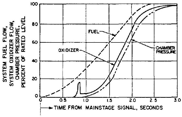 During the start and shutdown transients of an engine system, propellant flow and pressure characteristics are determined by engine system design characteristics. Figure 6-31 shows the propellant flows and chamber pressure buildup history for a typical engine start transient. Note temporary oxidizer flow drop as a result of LOX