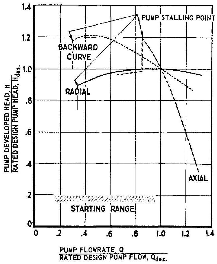 One of the most significant pump off-design characteristics is the pump stalling point which usually occurs in the low-flow region. The pump operation tends to be erratic at this point, resulting in the abrupt loss of developed head and the danger of overspeeding.