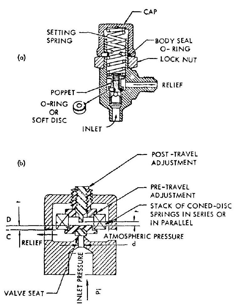 Figure 7-66(a) shows the design of a typical low-capacity, direct-operated gas pressure relief valve. The valve poppet is loaded directly by a coil spring. This is one of the simplest designs. It may, however, become dynamically unstable under externally introduced vibration.