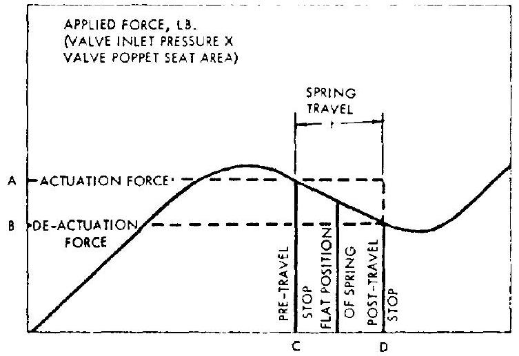 Figure 7-66(b) is the schematic of an improved design of a direct-operated relief valve. It assures a predictable dead band and eliminates chatter under vibration. This design employs coned-disk-type (Belleville) springs, operating between positive stops, in the negative rate portion of the force-deflection curve of the spring. As shown in figures 7-66(b) and 7-67, the spring remains against pretravel stop , until the applied force (valve inlet pressure valve poppet seat area ) reaches a level . The spring then snaps from to the
