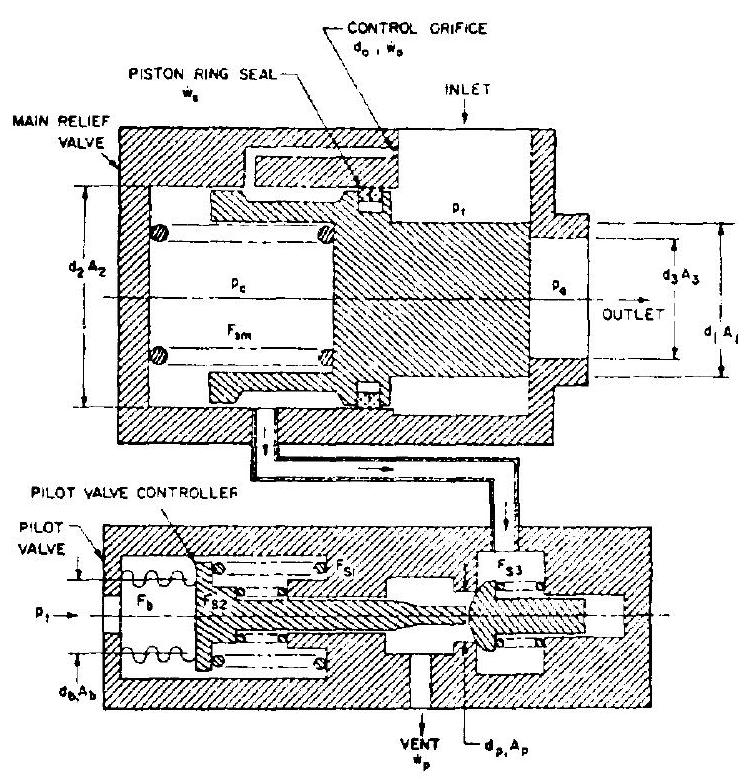 Figure 7-68 presents the schematic of a typical high-capacity, pilot-operated tank gas pressure relief valve. Normally, both main and pilot valves, are held closed by valve spring forces , and pressure . The pilot valve