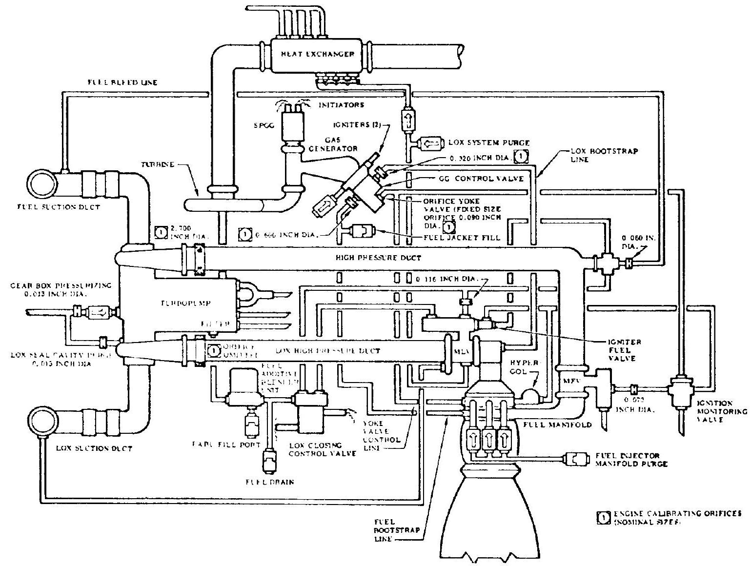 The systems described in the preceding paragraphs require proper adjustment and calibration for desired engine operating characteristics and performance. This includes the setting of timing devices, pressure switches, position switches, and the sizing of orifices. The correct values for each of these are verified during engine calibration and checkout firings. Of the orifices, some are placed in propellant lines for performance parameter calibration. Others are used in pneumatic or hydraulic lines as timing and restricting devices. Specific orifice applications for thrust and mixture ratio control will be discussed in sections 7.3 and 7.4; orifice design