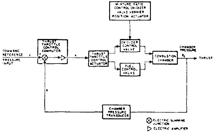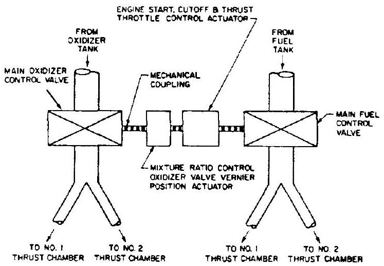 following amplification and compensation as required, is used to drive the thrust throttle control actuator of the main propellant control valves in a direction which reduces the error. Ideally, the system operates over the entire thrust throttle range with minimal disturbances to other critical engine parameters; in particular, the propellant mixture ratio. In practice, these disturbances are not entirely avoidable, but can be minimized by maintaining a given resistance ratio between the two main propellant control valves throughout the control range. A most reliable method toward this objective would be mechanical coupling of the two propellant valves (fig. 7-4).
