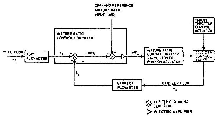 In certain cases, such as in last stages, or in missions requiring engine restart following extensive cruising periods involving propellant boiloff, a closed-loop system may be required. In figure 7-5 we see the A-4 stage engine mixture ratio control loop which operates on the basis of continuous propellant mass flow sensing. Both fuel and oxidizer mass flow rates are monitored and integrated to establish the ratio of either the propellants consumed or the propellants remaining. The mixture ratio feedback, , is then compared with a command reference mixture ratio input, , in the propellant utilization control computer. The resulting error signal, , is fed to the mixture ratio control oxidizer valve vernier position actuator, which forms a link in the mechanical coupling between the two main propellant control valves, as shown in figure 7-4. The oxidizer flow rate is thus modified to eliminate the error. In high-thrust turbopump-fed engine systems such as the A-2 stage engine, where the propellant valves are independently actuated, the system propellant mixture ratio control can be accomplished by varying the main oxidizer flow in a similar manner. For instance, a propellant-utilization servo control valve, which regulates the pneumatic pressure to the main oxidizer valve actuator, may control the oxidizer flow by adjusting the angular position of the oxidizer valve gate during engine mainstage operation. In certain applications it may be desirable to integrate the propellant flow rates and to compare the masses consumed to one another and to those tanked for optimum propellant utilization.