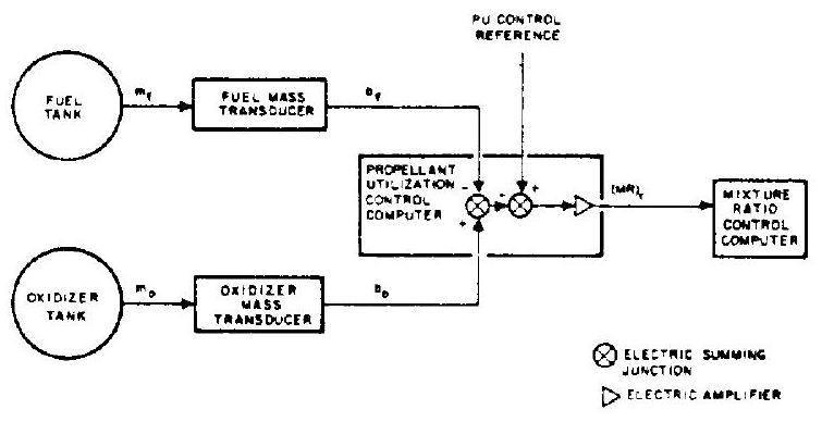 Figure presents the propellant utilization control system for the A-4 stage propulsion system. The residual propellant quantities in the main tanks are continuously monitored, summed, and compared with a control reference in the propellant utilization control computer. Any error detected is used to modify the command reference mixture ratio input, , to the mixture-ratio control computer. This method isolates the mixture ratio control from the propellant utilization control, and thus prevents interaction between them. The bandwidth of the