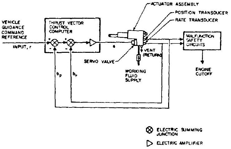 Figure 7-7 presents a simplified schematic for a thrust vector control system, employing hydraulic or pneumatic actuators. It may serve to explain the fundamentals of closed-loop thrust