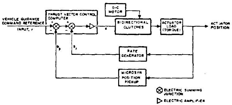 A typical schematic for a thrust vector control system using electromechanical actuators is shown in figure 7-8. Here, the actuator is powered by a continuously operating, constantspeed, 28 volt dc motor, fitted with dry-powder metal bidirectional clutches. The control computer consists of summing junctions and an amplifier as in the case of hydraulic actuators. The dc motor drives the actuator through the bidirectional clutches which are controlled by the error signal generated through comparing guidance command reference input with systems position feedback. To provide adequate systems damping, the actuating speed is sensed by a rate generator or through differentiation of the position signal.