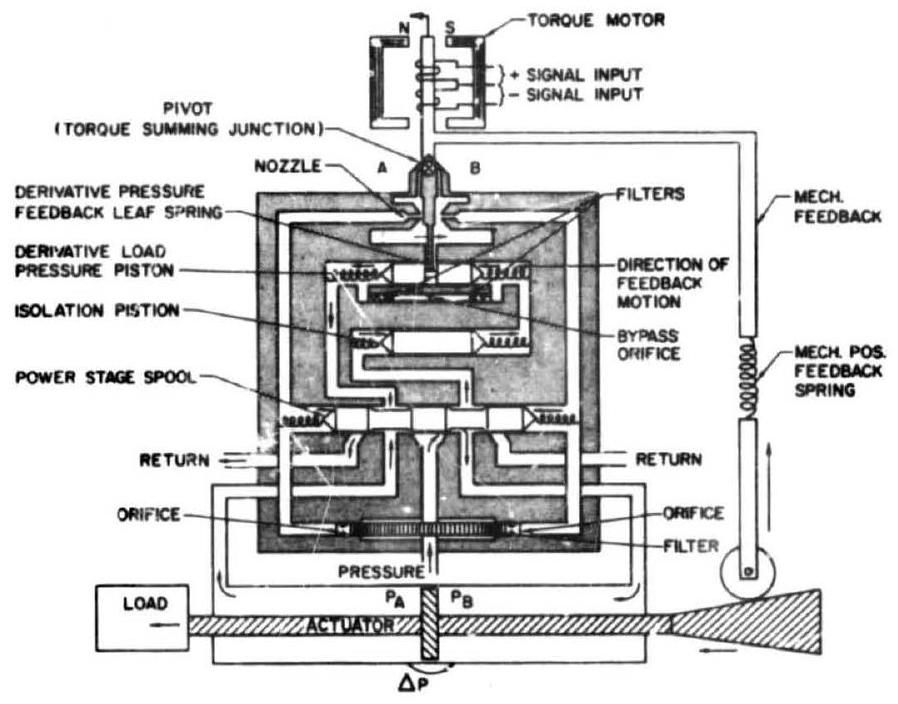 and decreases, forcing the actuator piston to the left to apply the desired load force. Attached to the actuator piston rod is a tapered extension which acts upon the mechanical feedback linkage, including a roller and a spring. The mechanical feedback attaches to the torque motor. The pivot point of the valve flapper becomes the error torque summing junction. Note that the nozzle jets also have a feedback effect. The time derivative of the actuator motion, i.e., the hydromechanical compensation, is obtained through action of a derivative load pressure piston. This piston is affected by the same pressure differential that acts upon the actuator piston; i.e., by the load pressure. However, by inserting an isolation piston and permitting flow through an orifice bypassing the derivative pressure piston, the pressures affecting the latter can equalize. The degree of this effect is a function of the actuator pressure differential and its rate of change and of the bypass orifice size (shock absorber principle). As seen in figure 7-9, the derivative load pressure piston acts upon the valve flapper when displaced. Thus it provides the required time derivative of the actuator motion for compensation.