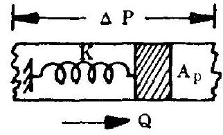 Figure 7-9 shows a typical servovalve and actuator schematic with derivative pressure feedback (DPQ) and mechanical feedback. The only electrical signal required is the input to the "torque motor" (an electromagnetic actuator) resulting in deflection of the flapper of a differential valve, which drains to the sump. If the flapper is deflected, as indicated in figure 7-9 by the arrow, nozzle flow on side decreases, with an attendant pressure rise. The reverse is true for side . The resulting pressure differential forces the power-stage spool to the left, blocking the return line on side , and opening it on side . As a result, pressure increases,