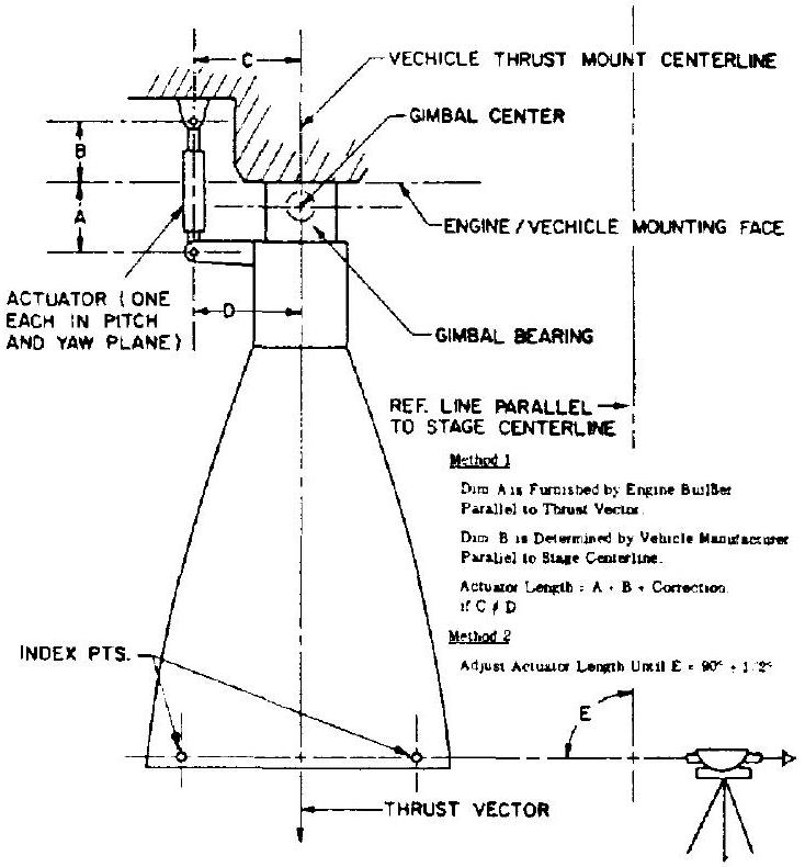 For minimum demands on the vehicle guidance and engine actuation systems, it is required that the engine thrust vector be properly prealined with respect to the vehicle attachment point in all three planes. Typical specified tolerances are: inch laterally, vertically.