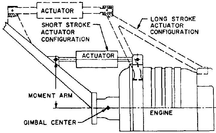 Figure 7-13 shows two typical engine actuator installations. The short-stroke configuration has the advantage of high spring rate and high stiffness, and of compactness. However, the effective gimbaled mass is high, requiring larger actuators and a more powerful hydraulic system. Resolution is low (gain, expressed in degrees deflection per inch actuator stroke, is high). The long-stroke design results in low effective gimbaled mass and reduces actuator size and hydraulic system dimensions. However, the spring rate is low and so is the stiffness. Moreover, the arrangement is bulky and requires extra structural members. Only a detailed design analysis conducted jointly by engine and vehicle designer will determine which configuration is best for the flight system.