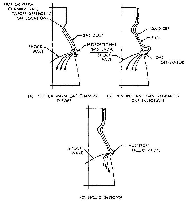 Thrust vector control through secondary injection of matter into the thrust chamber nozzle (SITVC) has been successfully applied to solid motors. It has found only limited, predominantly experimental application in liquid propulsion systems, where it appears especially promising for upper stage engines, in which the lateral forces required are smaller than with boosters. The principal methods of secondary injection are- (1) Gas injection, using- (a) Inert stored gas (b) Thrust chamber tapoff (fig. 7-17A) (c) Gas generator (fig. 7-17B) (2) Liquid injection (fig. 7-17C), using- (a) Inert fluid (b) Propellants