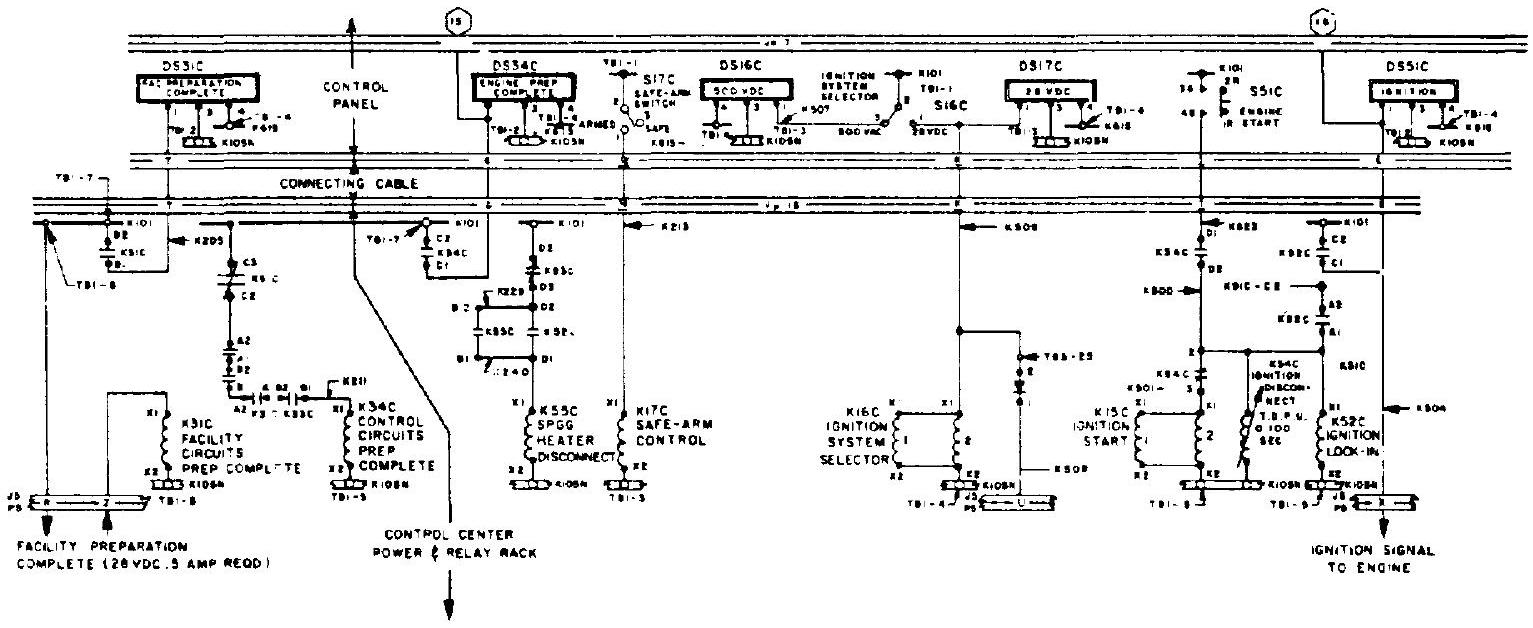 K28C, "Hypergol Cartridge Installed," as well as the normally closed contacts of cutoff relay K91C. If all contacts are properly closed, the "C" contacts of K34C will cause signal light DS34C to light up. Following selection of the ignition power source by means of switch S16C, ignition can now be initiated by means of pushbutton S51C, since the "D" contacts of K34C are now closed, and provided ignition disconnect timer K54C has not picked up (TDPU = time delayed pickup : 0.1 sec ). In the diagram, several circuit elements appear which are part of other circuits not discussed. Note that in places two relays are used in parallel (e.g., K16C), if the number of contacts required is too large for one relay. The numbers shown in hexagonal frames refer to the channels of an inking sequence strip chart recorder or equivalent instrument. A special test bus K615 is provided which when energized makes all signal lights go on and thus permits spotting burnt-out bulbs.