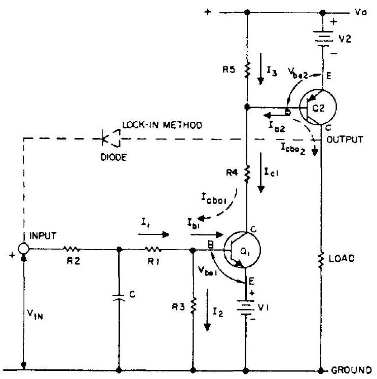 Transistor is held in a "turned off" mode by maintaining the base at a higher voltage potential than the emitter. This is achieved by inserting a bias voltage, . As can be seen, as long as there is no appreciable current flow in , the base potential will be essentially , while that at the emitter is . Thus, will remain off.