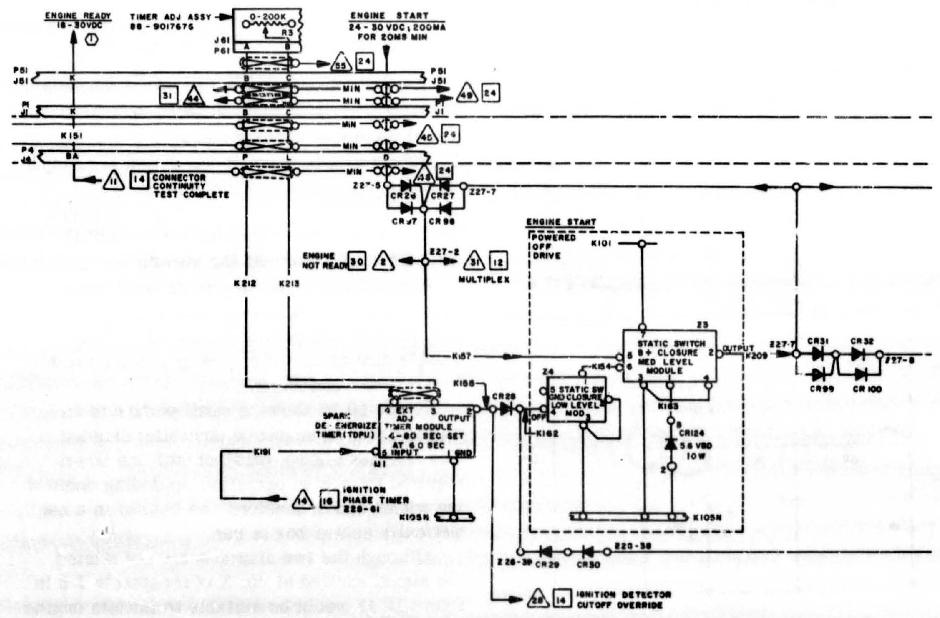 Although the two diagrams are not related, the signal emitted at pin X of receptacle J-5 in figure would be suitable to initiate engine start at contact A of plug P51 in figure 10-16. Similarly, the signal emitted from pin K of plug