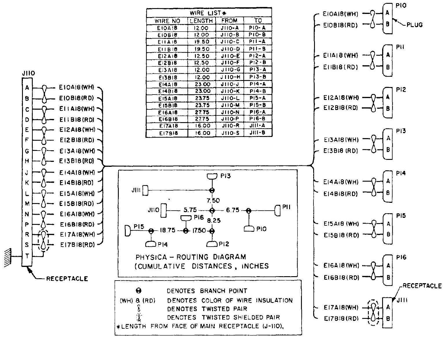 Figure shows portion of a harness installed on a liquid rocket engine. For manufacture, the engine systems designer must supply certain information. This is best combined into a single drawing, which contains the following information (fig. 10-19): (1) Wire list.-This list calls out each harness wire by number and lists its length. It also specifies the wire routing between plugs and/or receptacles. (2) Harness schematic.-For clarity, the schematic repeats in pictorial form most of the information supplied in the wire list, together with additional information. It also calls out the total length of wire required for material procurement purposes. (3) Physical routing diagram.-This diagram defines the branch points and their relative distance from the main plug or receptacle. It is usually difficult to determine the exact length of individual wires and of some of the branches on the drawing board. It is customary to finalize these dimensions on a mockup engine. For this reason, certain dimensions in the physical routing diagram are left blank and the total cable length is specified "as required."