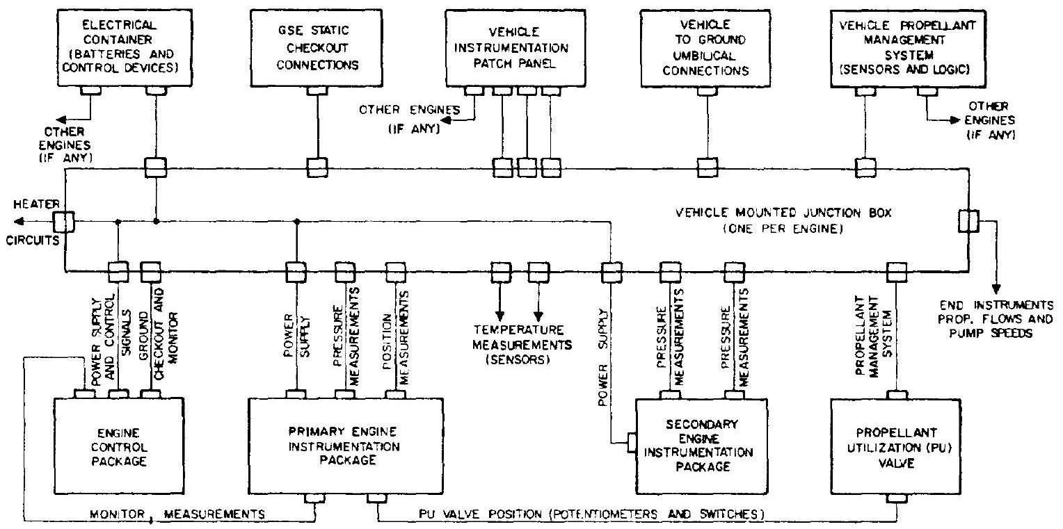 In addition to the cabling required to interconnect the various engine electrical subsystems, other cables are required to link these systems to the vehicle systems. This includes wiring for power supply, controls (start and stop, PU, throttling, etc.), instrumentation and checkout circuits. To facilitate engine installation and line connections, these wires are combined into trunks, each terminating in connectors which must have, at the proper location, a mating counterpart on the vehicle. For the stage, a "J-Box" (junction box) is recommended, into which are plugged both the engine and the stage systems connectors. On the inside, the box permits easy and environment protected redistribution of incoming and outgoing wires to assigned connectors. Figure 10-20 shows a typical block