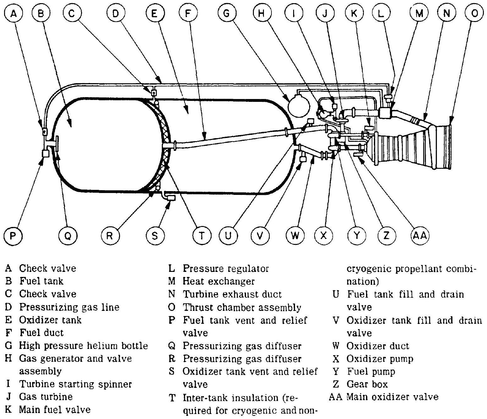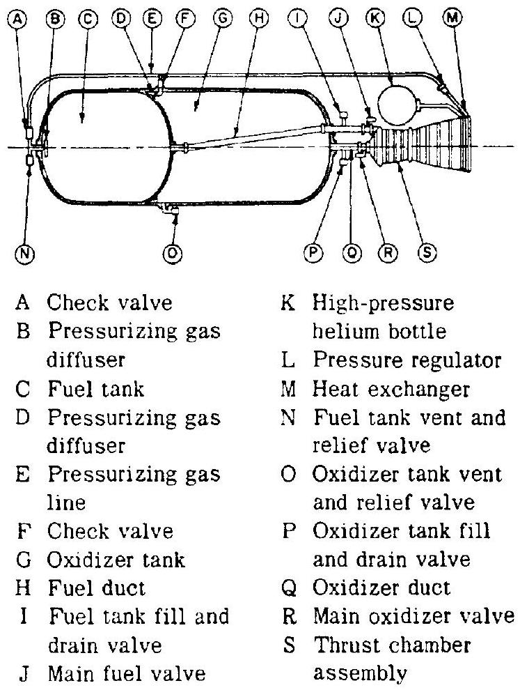 Thus prepared, we may now proceed to subdivide the engine system further into major components or subassemblies as follows: (1) Thrust chamber assembly (2) Propellant feed system: One of the following two is generally used: Pressurized gas propellant feed system and turbopump propellant feed system. The latter includes some type of tank pressurization system (3) Valves and control systems (4) Propellant tankage (5) Interconnect components and mounts